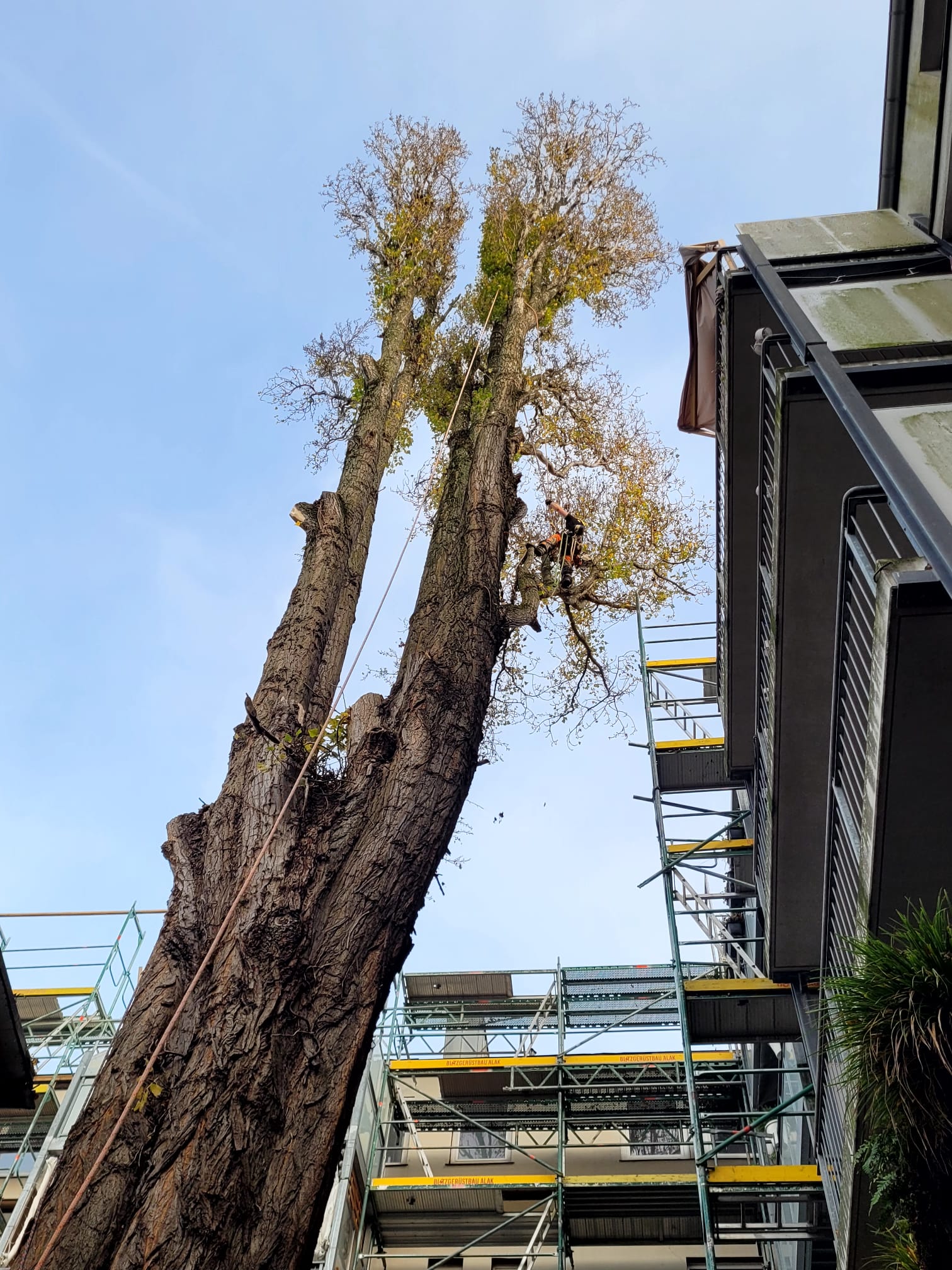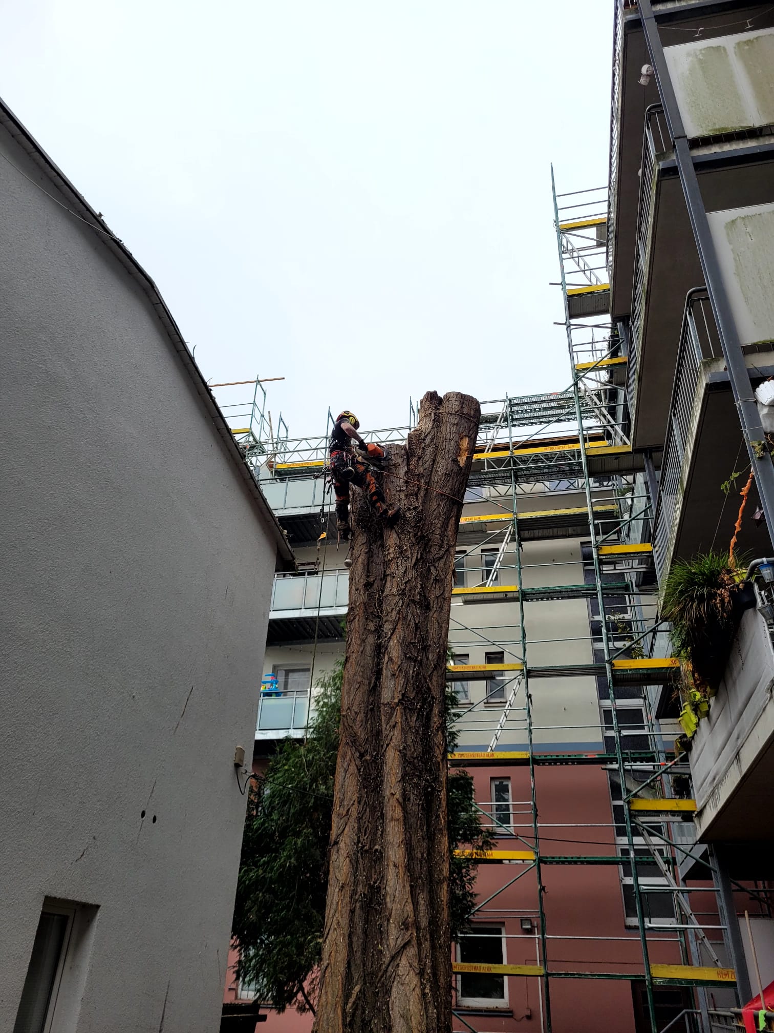 - Pień bezpiecznie opuszczony w kawałkach, rusztowania i elewacja bez rysy